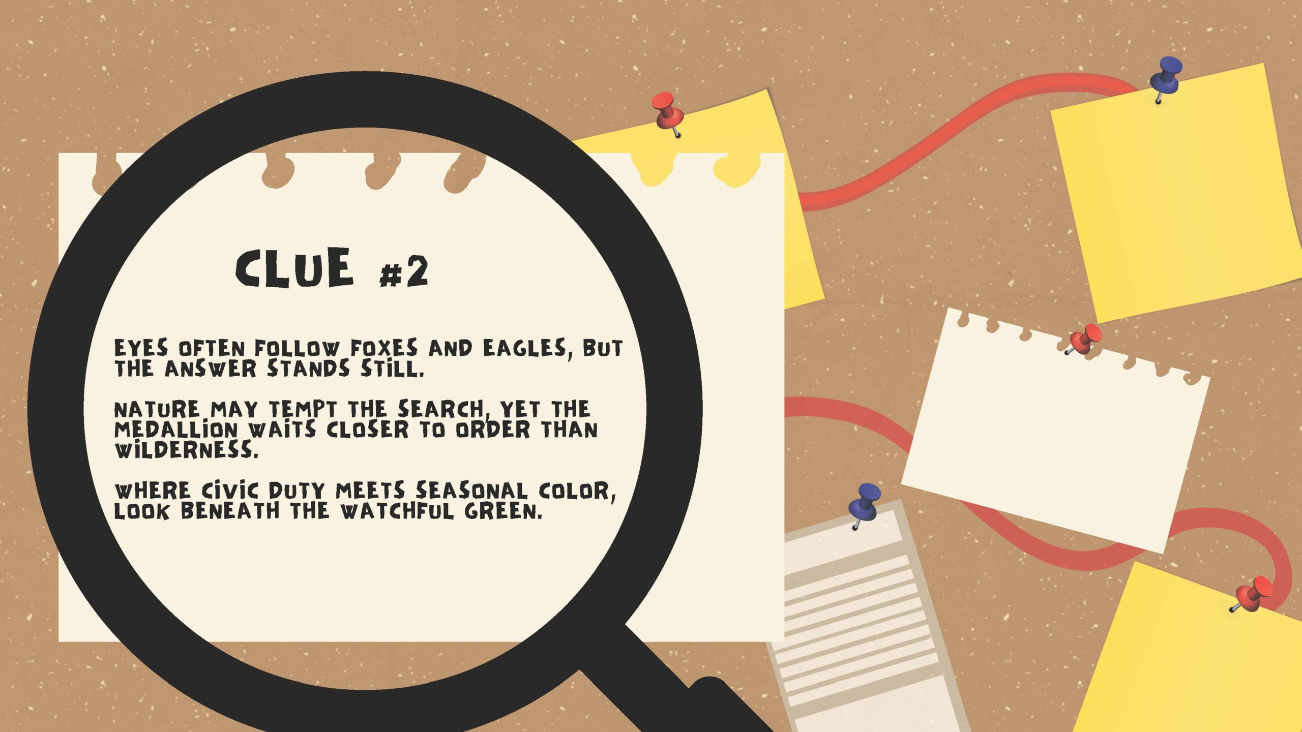 Clue #2: Eyes often follow foxes and eagles, but the answer stands still. Nature may tempt the search, yet the medallion waits closer to order than wilderness. Where civic duty meets seasonal color, look beneath the watchful green.