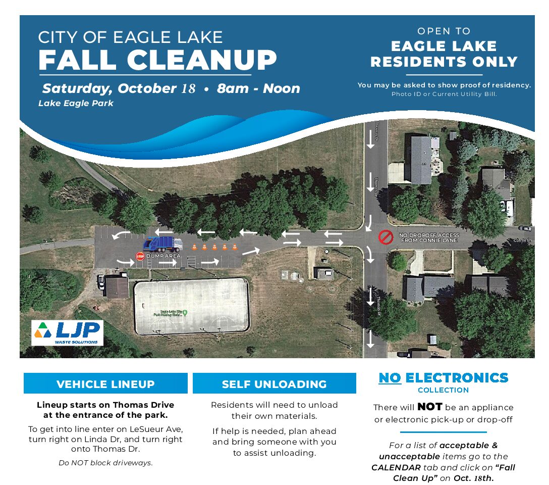 Eagle Lake residents are invited to take part in the annual Fall Cleanup Drop-Off Event on Saturday, October 18, from 8:00 a.m. to noon at Eagle Lake Park. Please note that the fall cleanup is a drop-off event only, while the spring cleanup offers curbside service. This event is open to Eagle Lake residents only, and proof of residency may be required. Electronics will not be accepted at the fall cleanup. We appreciate your cooperation and look forward to working together to keep Eagle Lake clean and beautiful.