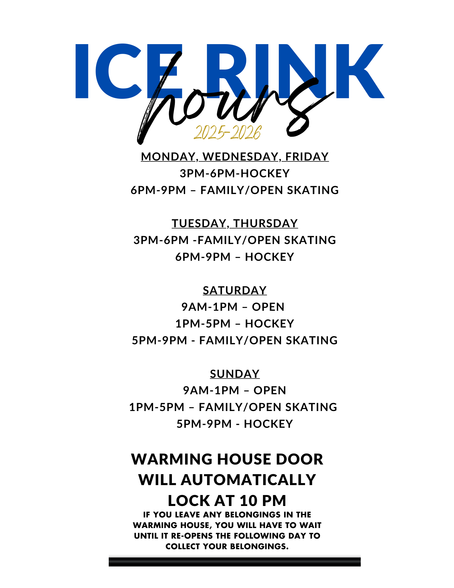 Important Reminder: The warming house door will automatically lock at 10:00 PM. Any items left inside after the door locks cannot be retrieved until the following day, so please be sure to take your belongings with you.